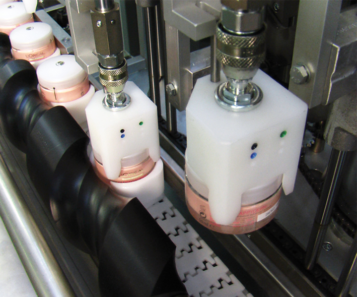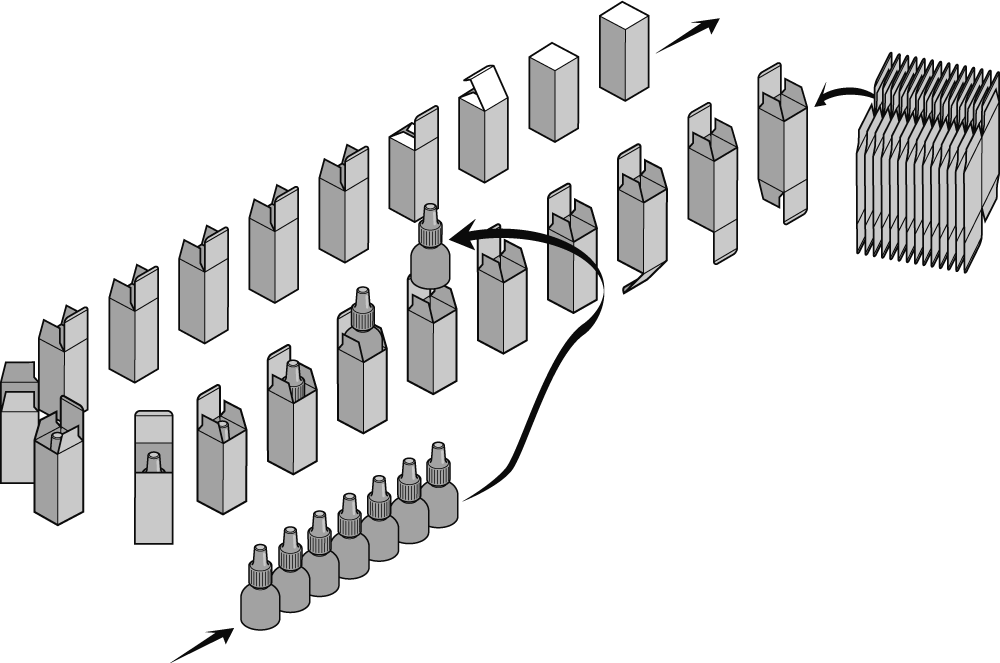 The wide range of product feeders available covers all possible packaging requirements of the market and is particularly suitable for bottles and jars. The introduction in vertical position eliminates all problems caused by horizontal introduction when traditional cartoners are used.