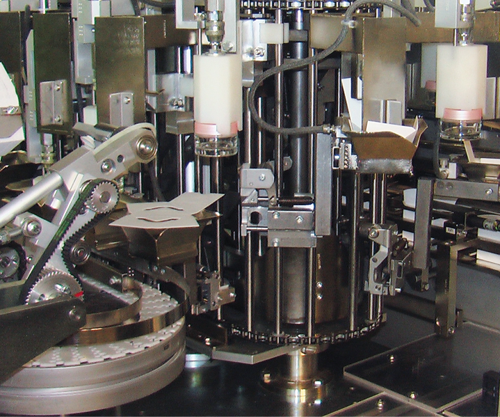 As all OAM continuous motion cartoning machines, AVC is characterized by the exclusive carton erection system incorporating a 4-station turret, each station separately driven by closed-profile cams for carton pick-off at zero speed. This system allows for total and progressive carton pre-breaking to be carried out in a time period longer than the machine cycle.