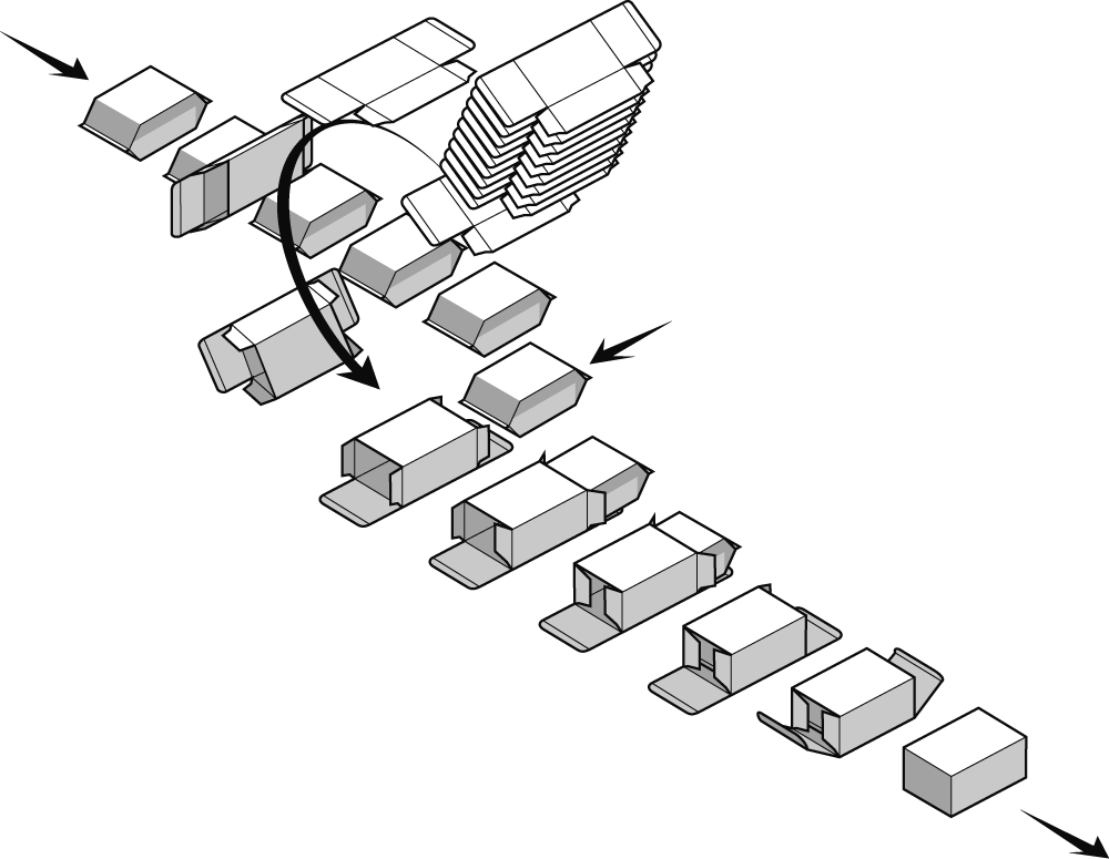 The possibility of adding a system of pusher with upper blades with differentiated stroke, enables perfect introduction of leaflets and/or booklets and other similar items into the carton, independently from the characteristics of the product to be handled.