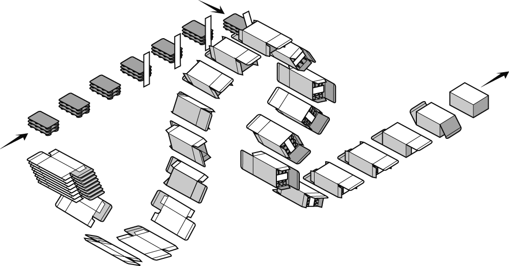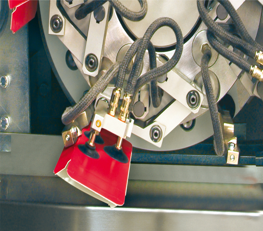 Each carton erection station is composed of two suction-cup arms which, by pulling externally on the two adjacent faces on the carton, guarantee a positive opening of the cartons even of low grammage and square section.